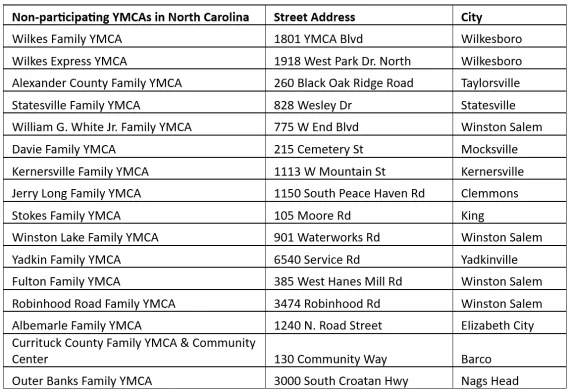 *The table below lists YMCA locations that are not currently participating in this program. Ambetter Health members near these locations still have full access to the digital YMCA360 platform, which offers a wide range of on-demand and live-stream classes.